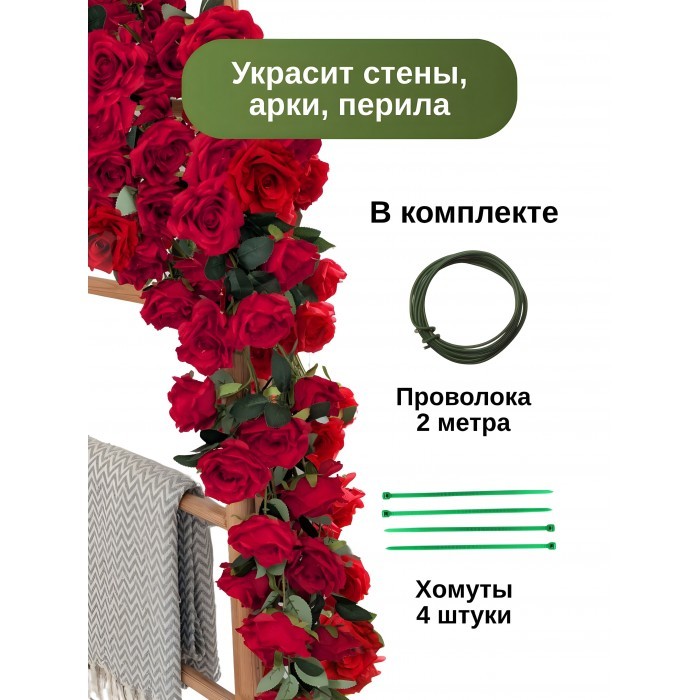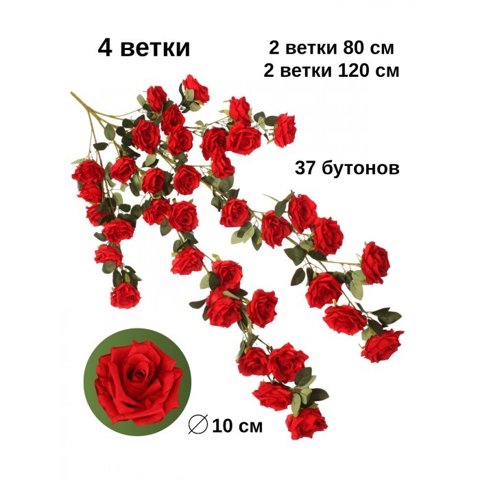 Цветы искуственные Розы каскадные (37 штук, 120 см, цветок 10 см) красный 265903