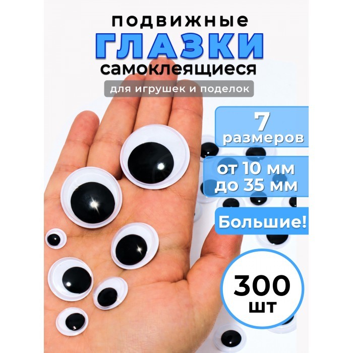 Глазки клеевые для игрушек самоклеящиеся (300 штук, 10/14/18/22/25мм по 50шт, 30мм-30шт, 35-20шт) 266217